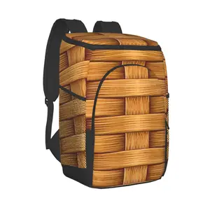 Protable Insulated Thermal Cooler Waterproof Lunch Bag Wooden Basket Weaving Print Picnic Camping Backpack